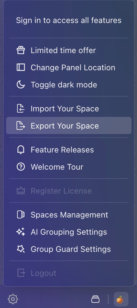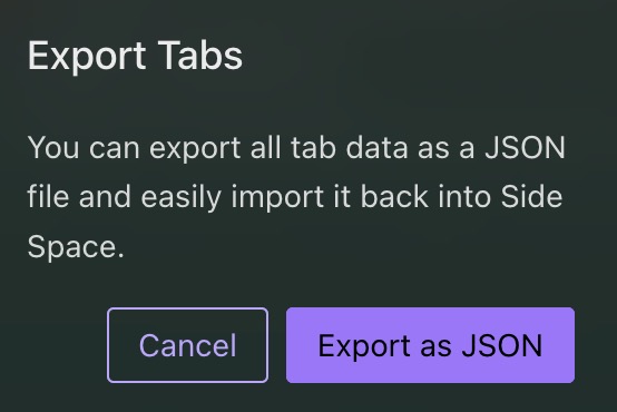 Side Space lets you export and import your data in JSON format, including spaces, groups, and tabs. This makes backing up or transferring your data simple and efficient.